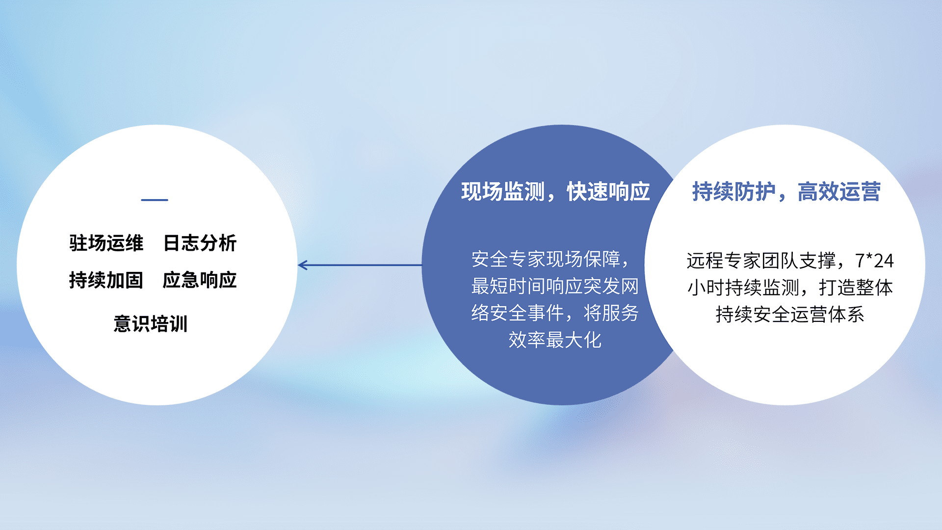 针对客户行业特性,,,,提供专属的一站式安全管理服务,,,,帮助客户全面感知网络空间威胁,,,,通过安全专家的线上、、、、线下防护支持,,,,实现风险闭环,,将安全保障常态化,,为客户打造常态化安全运维运营服务。。。